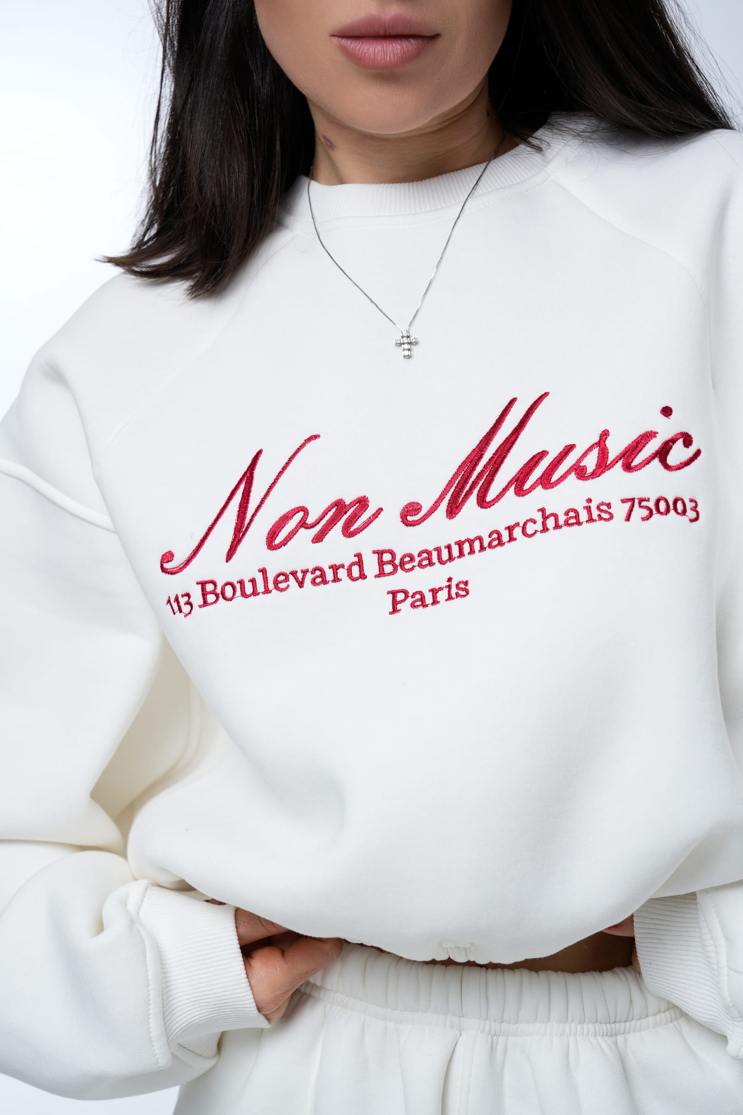 Декор: стильний об’ємний вишитий напис “Non Music — 113 Boulevard Beaumarchais, 75003 Paris” насиченим червоним кольором.