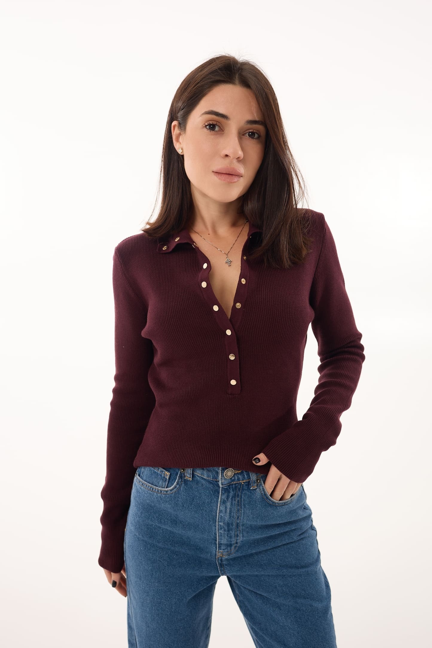 Топ Button Line Бордо – вишуканий та стильний акцент у вашому гардеробі. Насичений відтінок бордо додає образу глибини та виразності, створюючи атмосферу впевненості та жіночності. Трикотажна тканина щільно прилягає до тіла, забезпечуючи комфорт і витончену посадку.