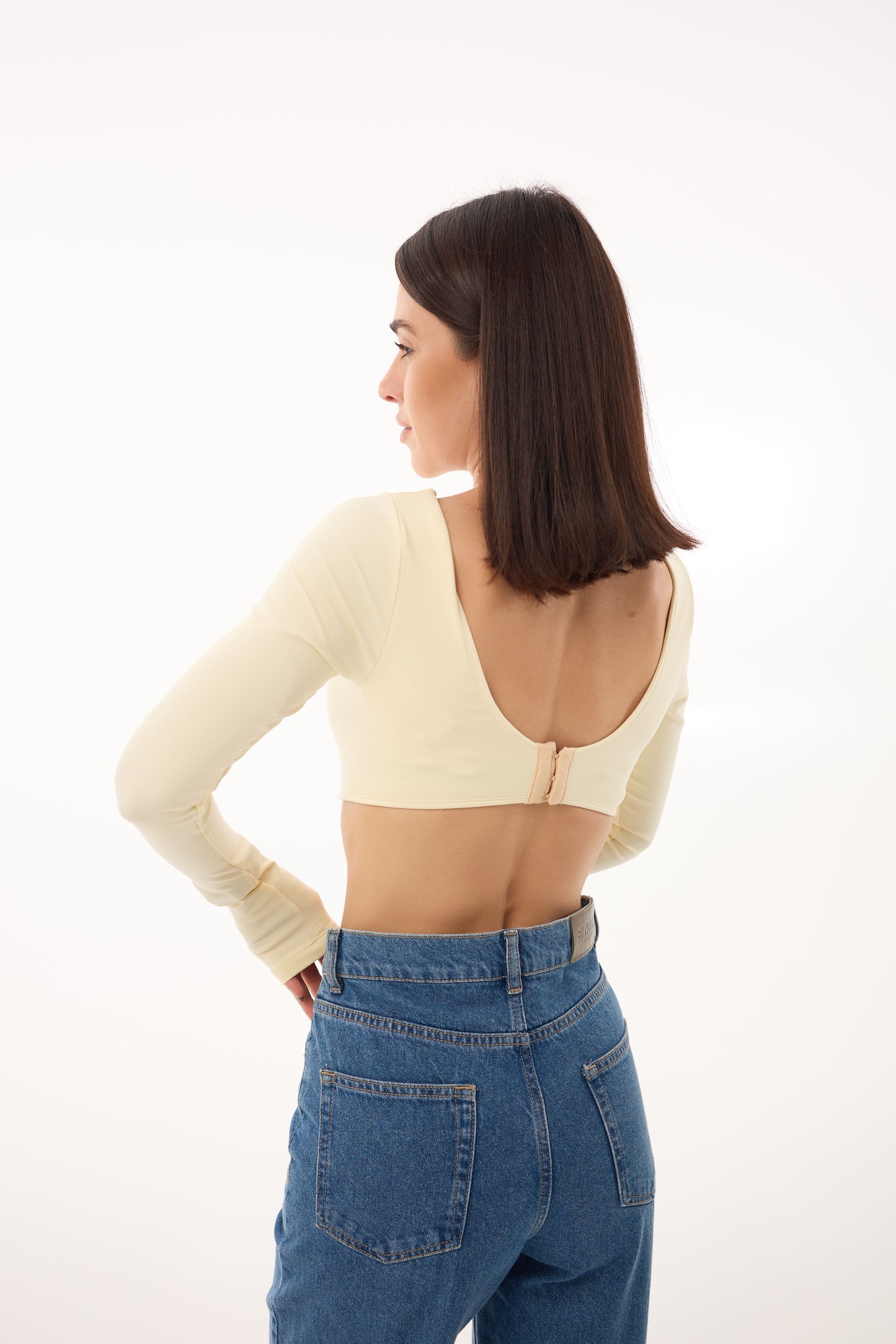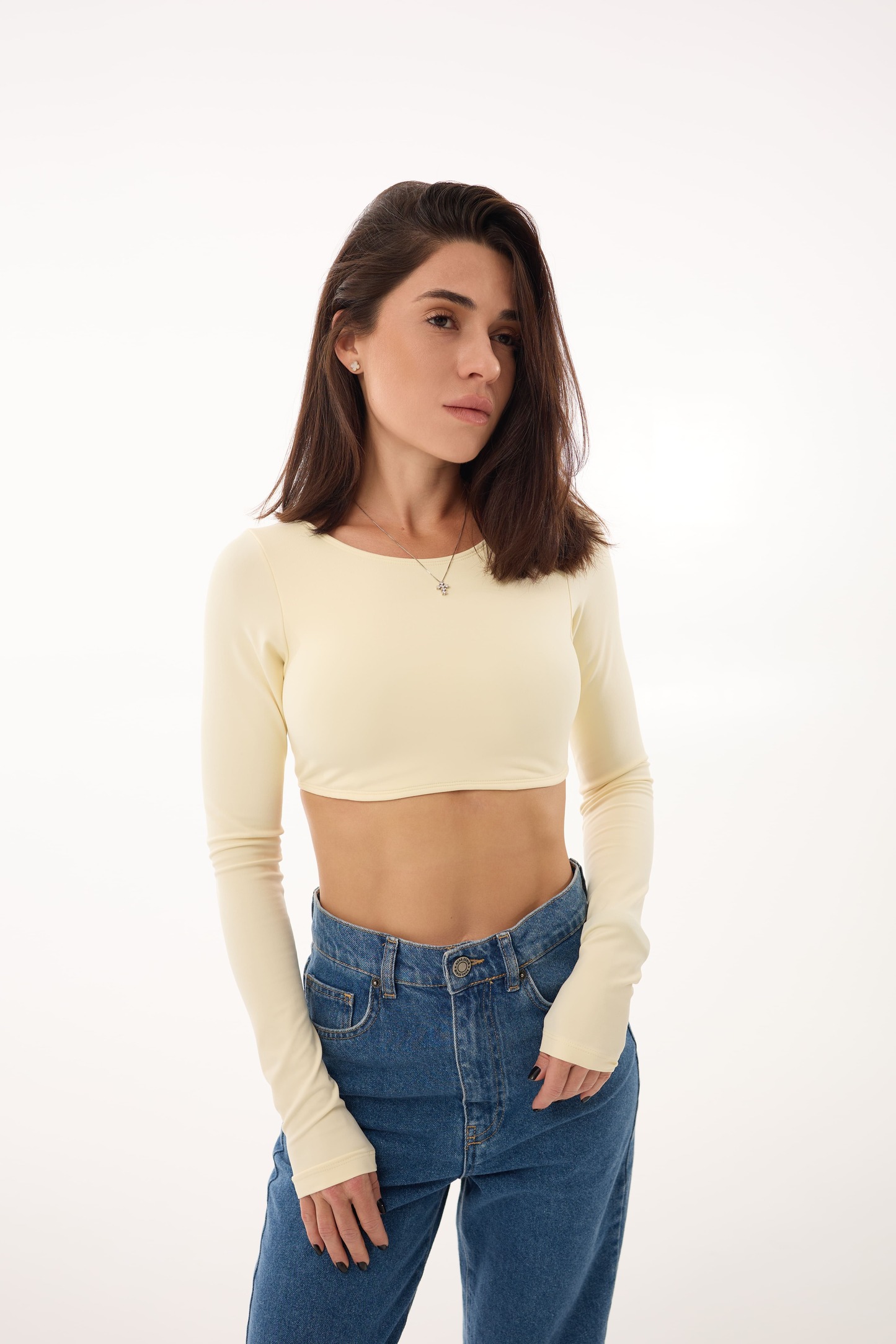 Топ Open Back Hook Жовтий створений для тих, хто цінує поєднання мінімалізму та ефектності. Ніжний жовтий колір надає образу свіжості та легкості, підкреслюючи літній настрій. Гладка тканина комфортно прилягає до тіла та не сковує рухів, а довгі рукави роблять силует більш витонченим.
