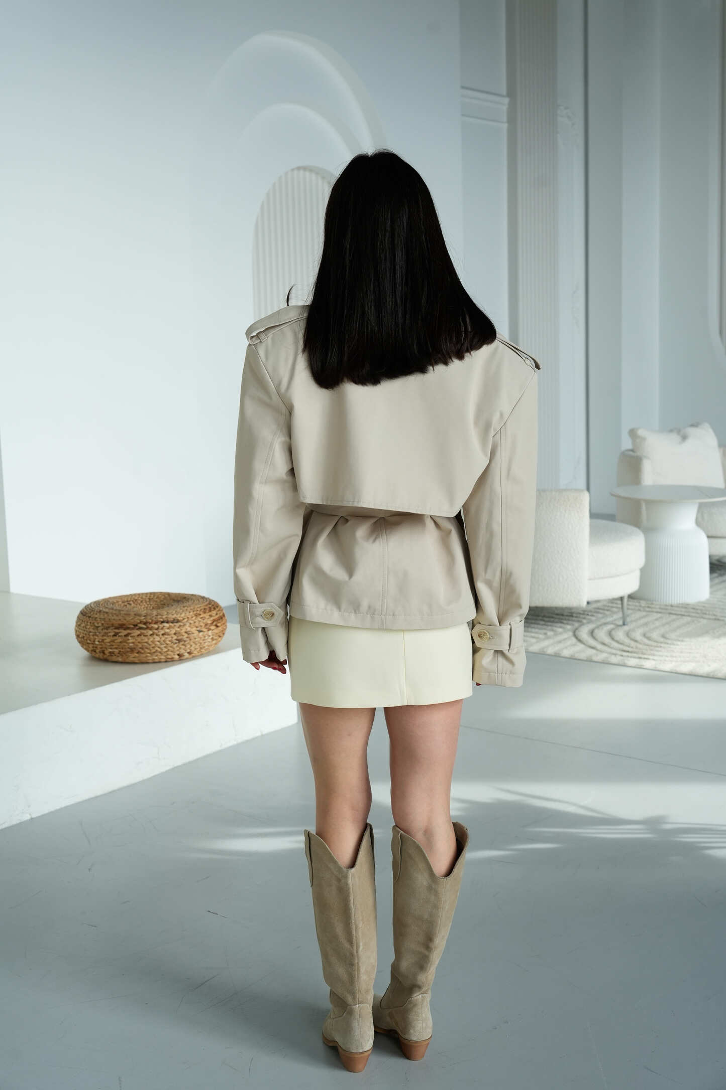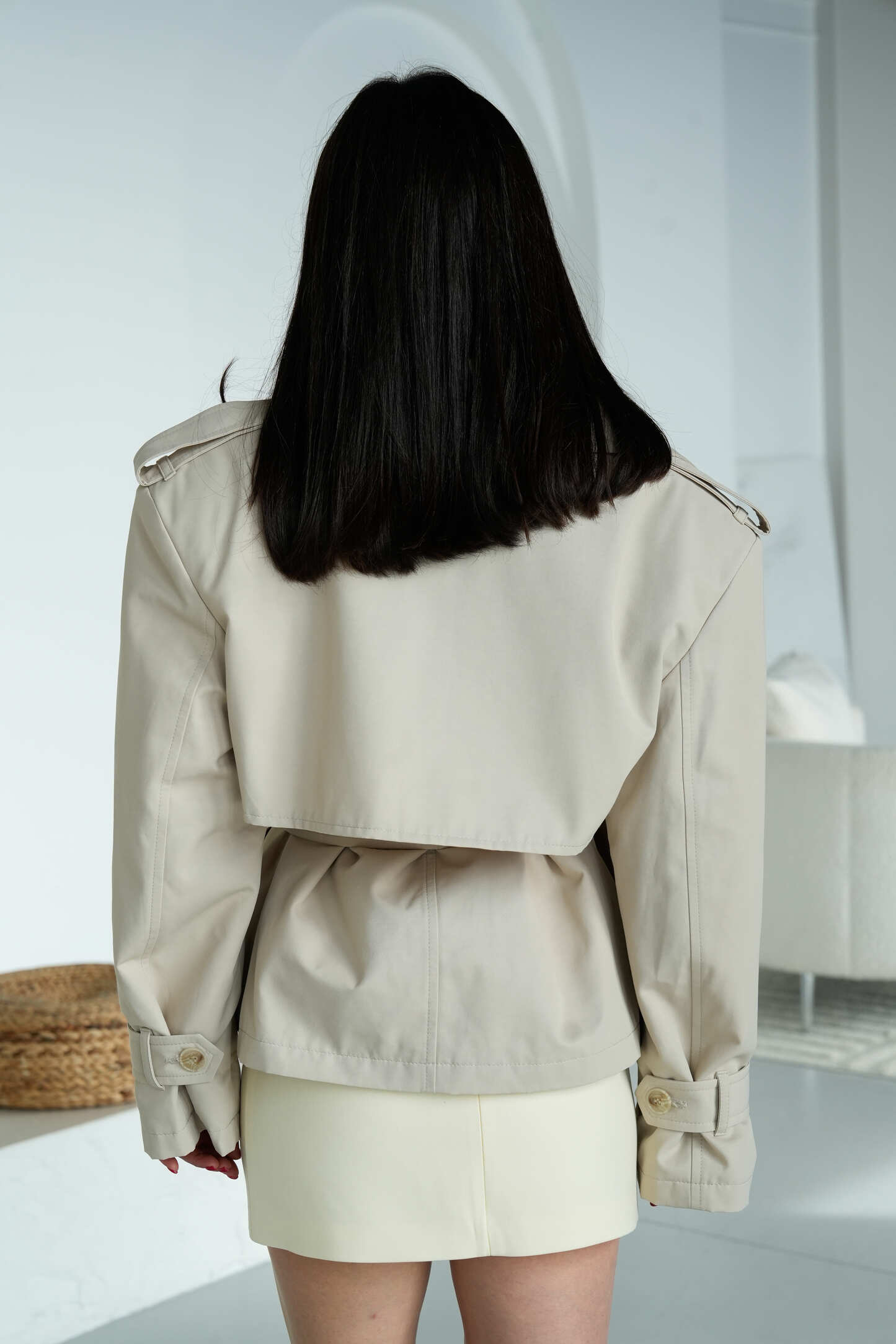 Тренч Elegant Form у відтінку холодного бежу — це витончена база з акцентом на чисті лінії та сучасну стриманість. Лаконічний крій у поєднанні з прохолодним нюдовим тоном створює елегантний, «чистий» образ, який виглядає дорого та легко адаптується під різні стилі — від мінімалізму до більш структурованих луків.