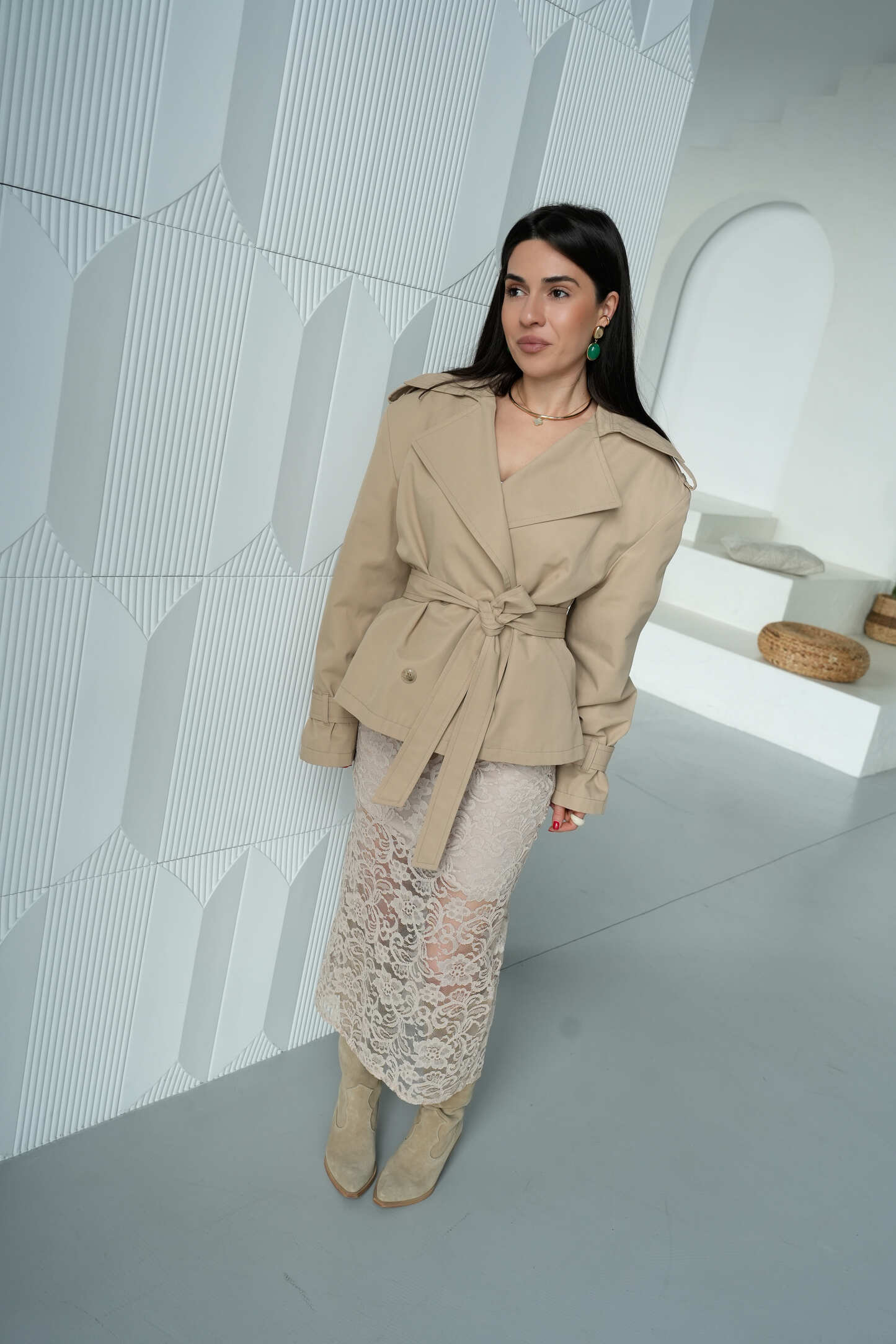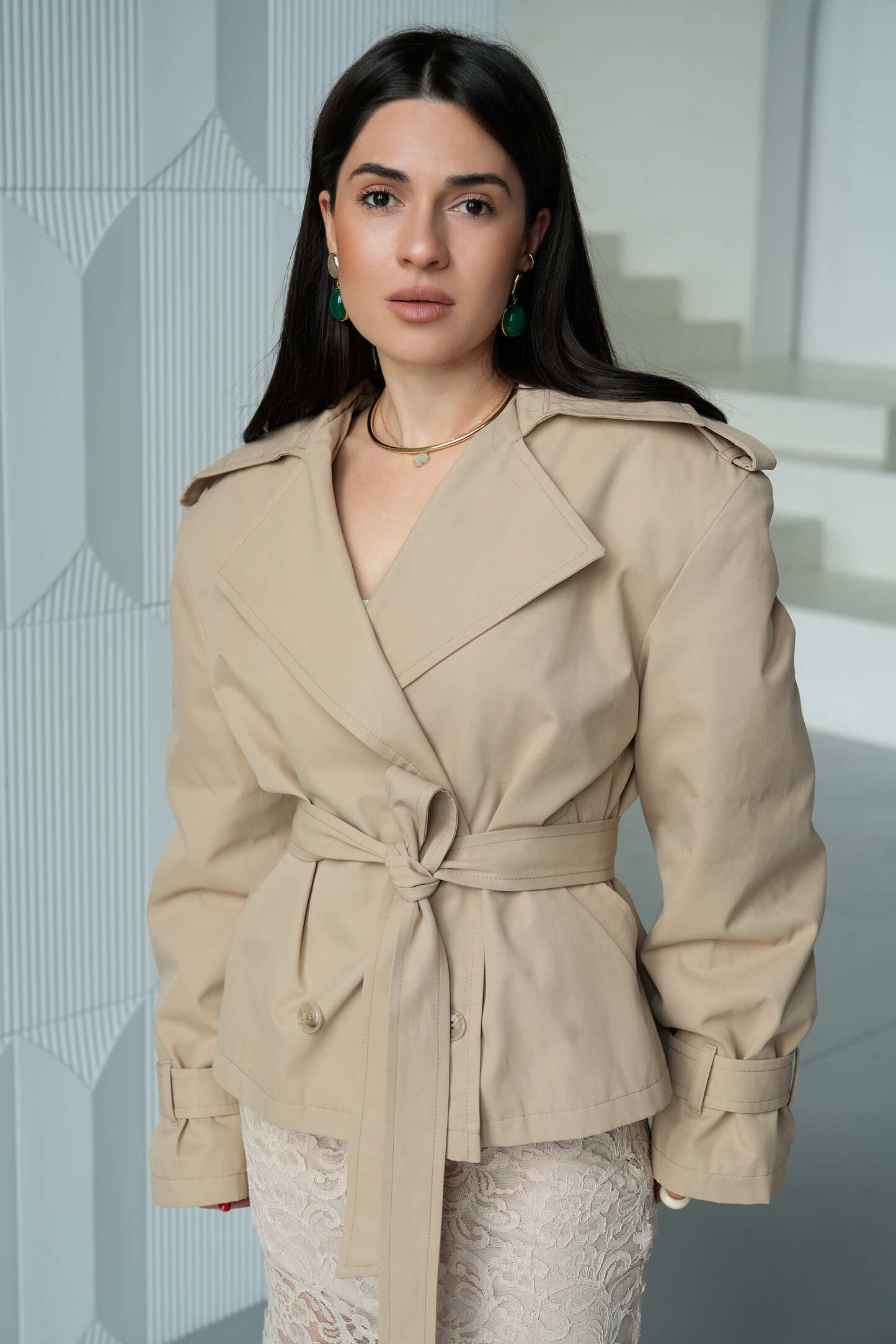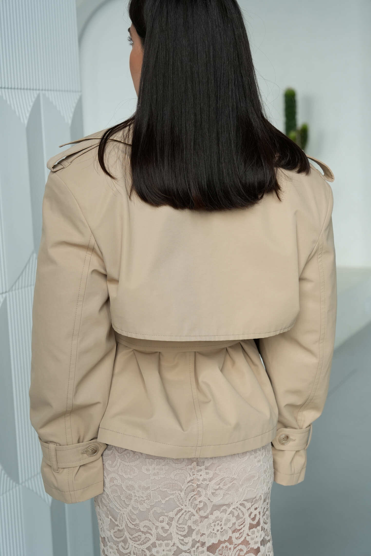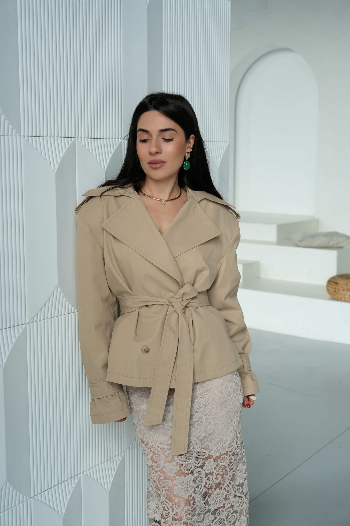 Елегантний укорочений тренч Elegant Form у пісочному відтінку — це сучасна інтерпретація класики, яка ідеально вписується в базовий гардероб. М’який силует, чітка лінія плеча та продуманий крій створюють витончений образ із акцентом на жіночність. Завдяки універсальному кольору модель легко поєднується як із повсякденними, так і більш вишуканими образами.