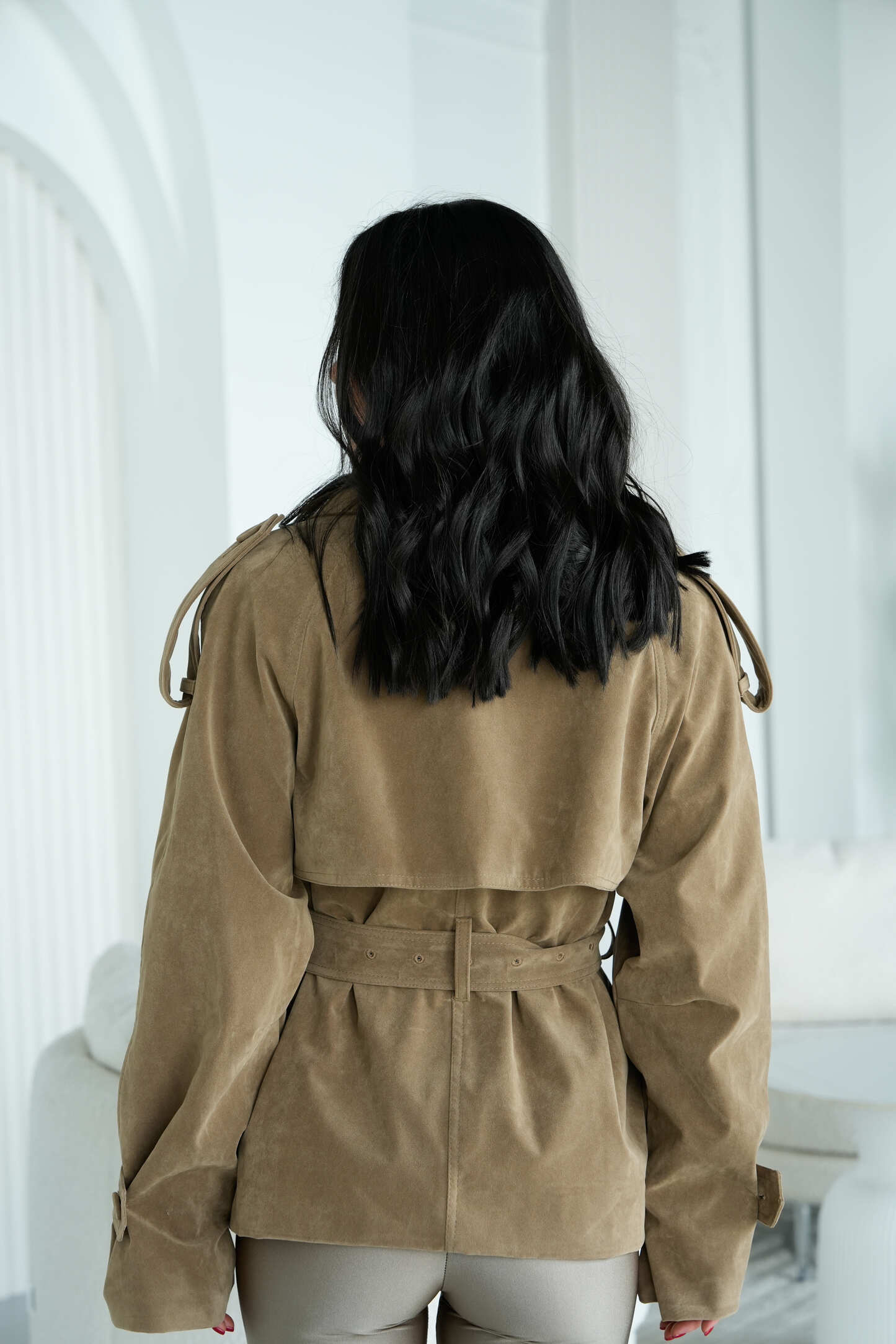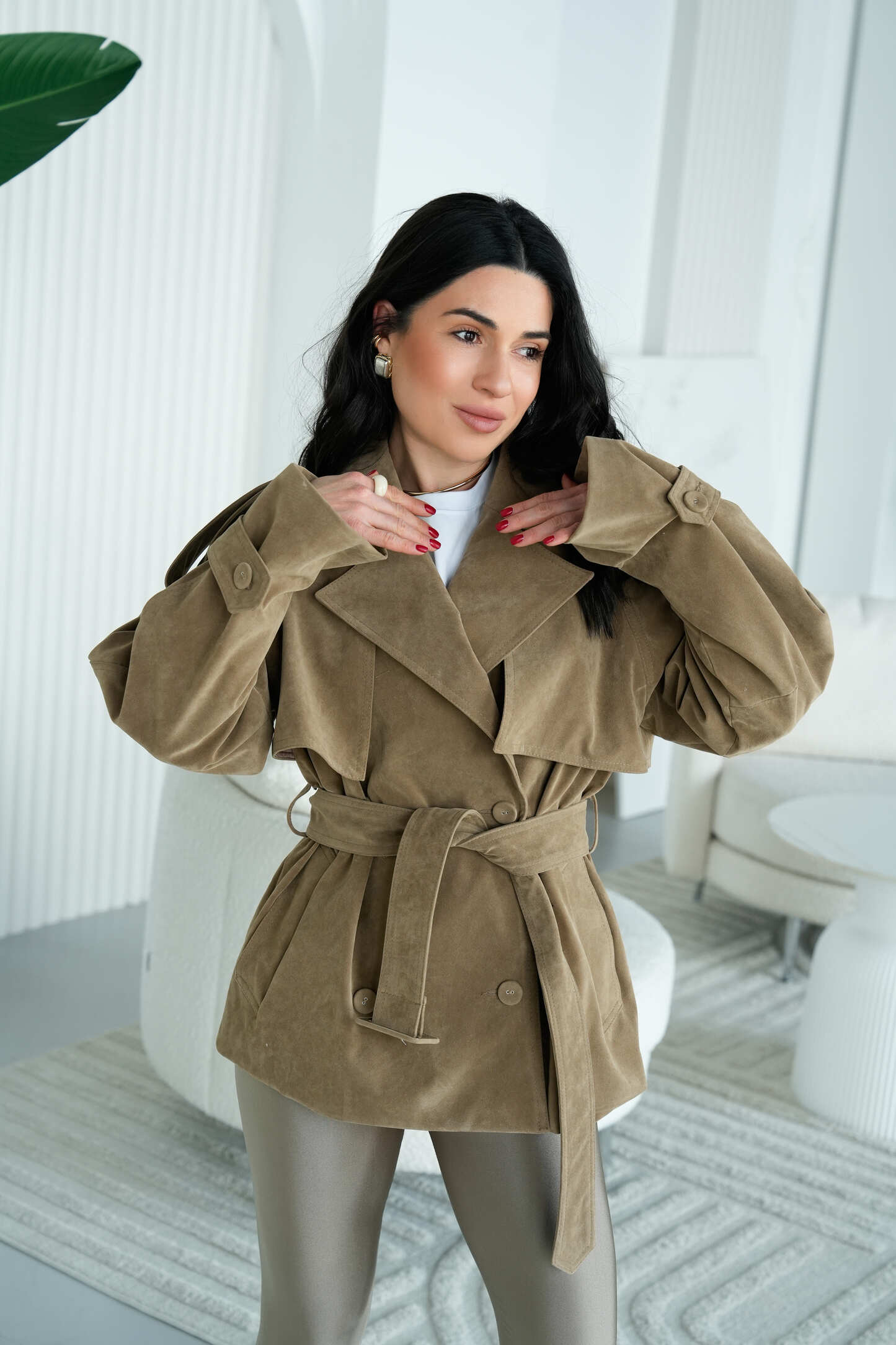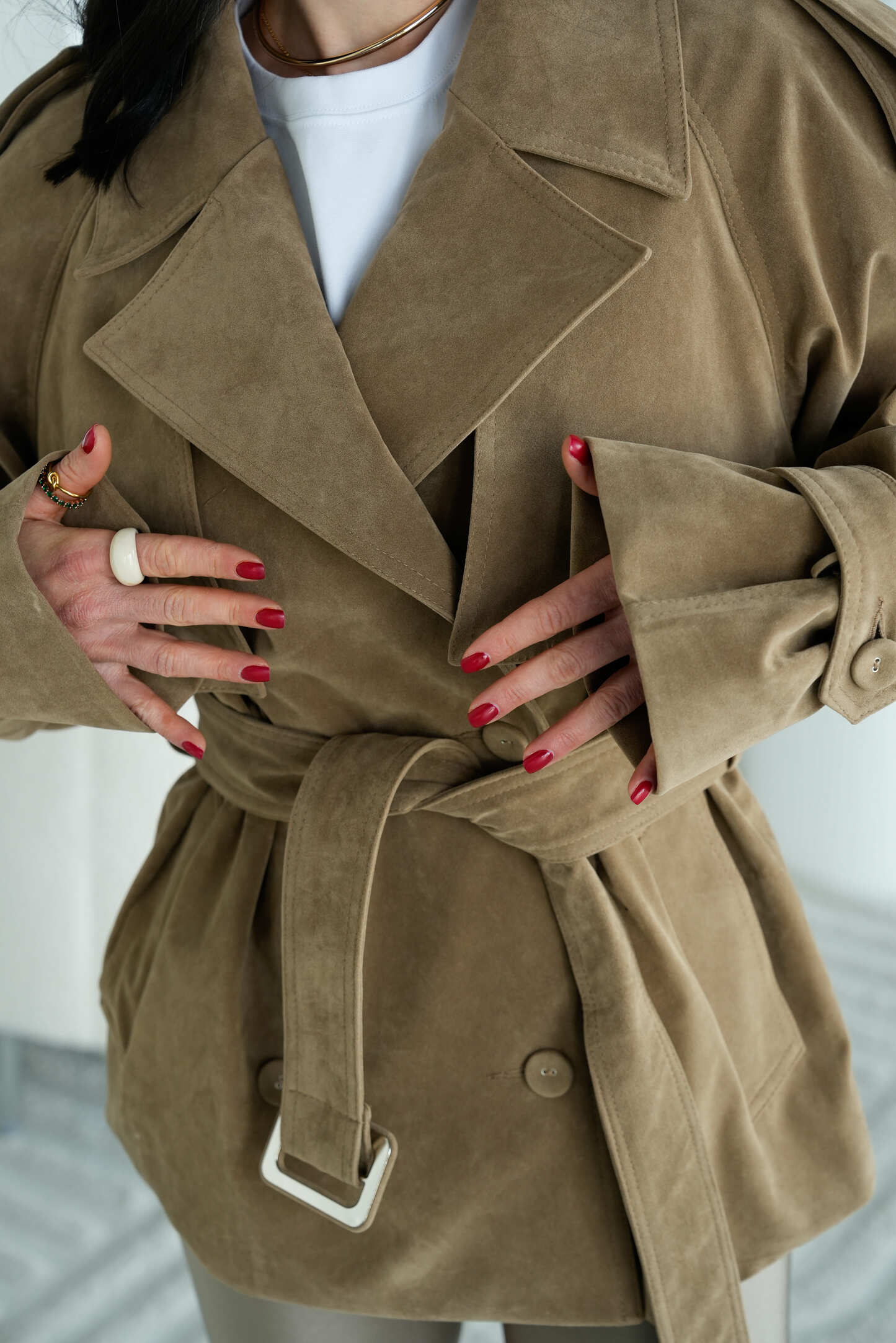 Тренч Suede Flow в оливковому відтінку — це витончене поєднання м’якості текстури та природної глибини кольору. Оливка виглядає стримано, благородно і легко інтегрується в базовий гардероб, додаючи образу сучасної естетики з природним настроєм.