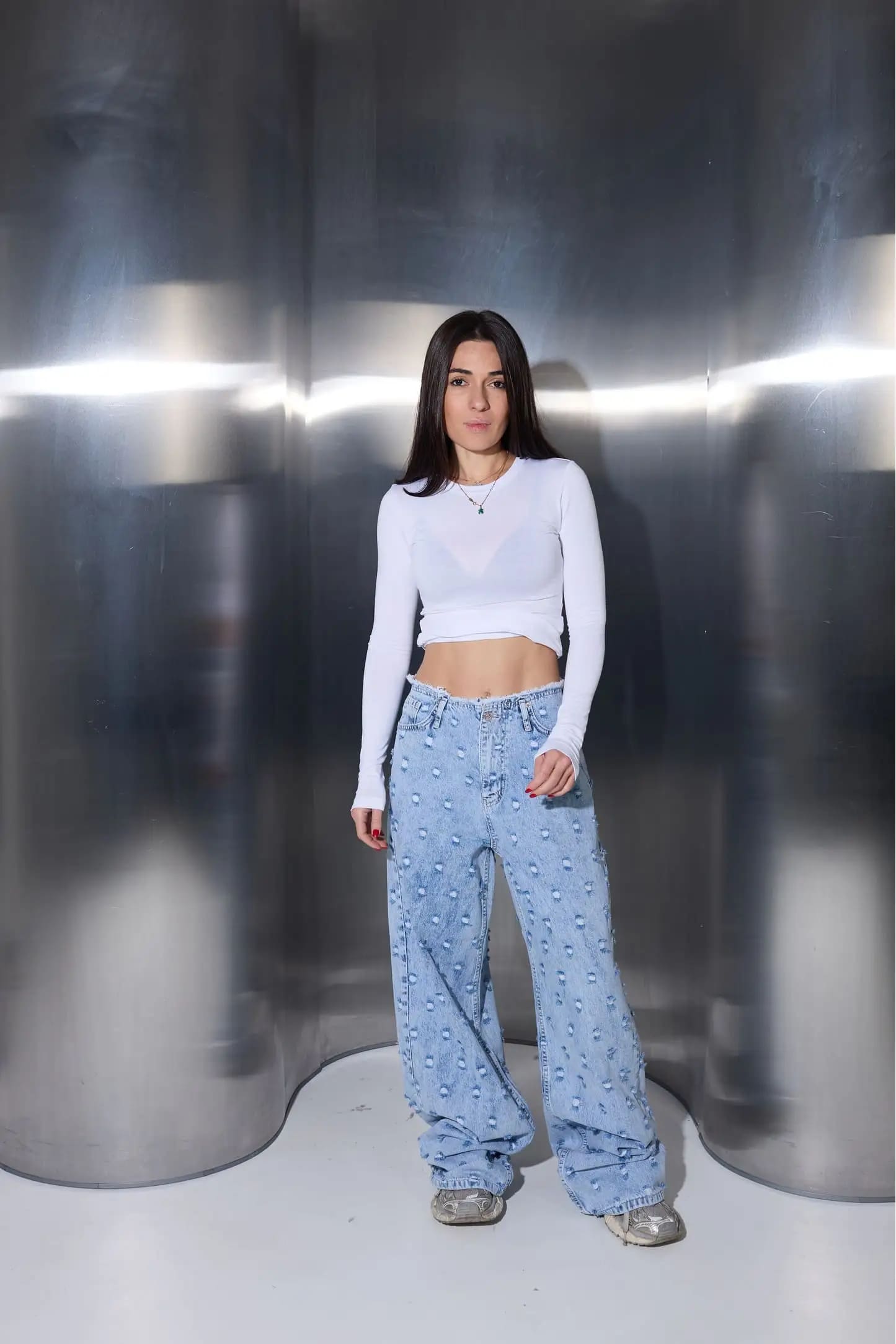 Для створення вечірнього образу обирайте джинси з високою талією, можливо з металізованим або атласним покриттям, з вишивкою або стразами.